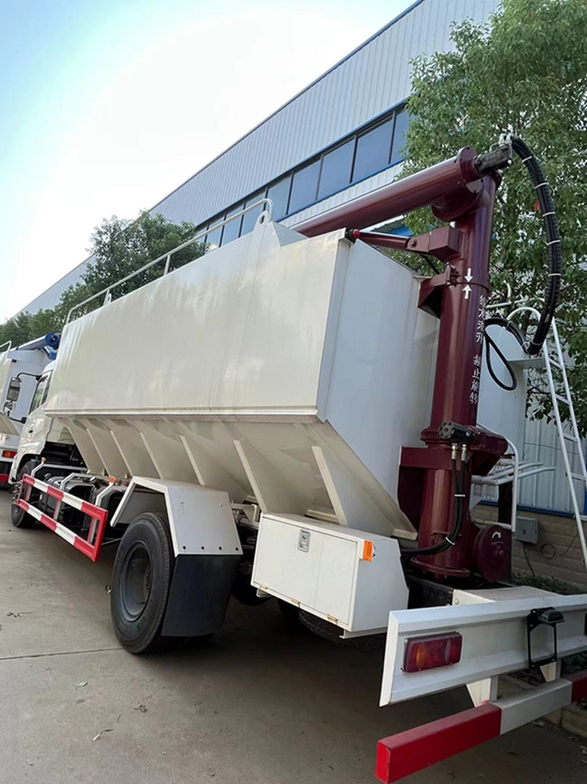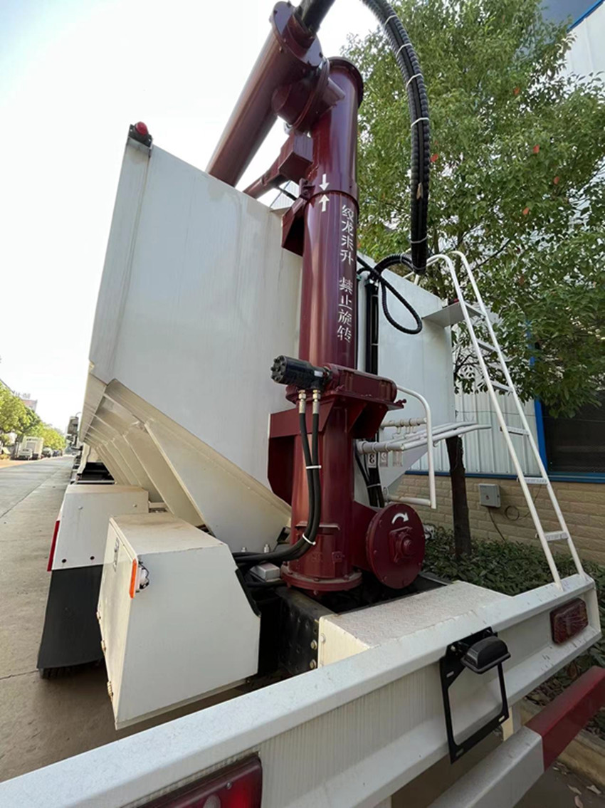 散裝飼料運(yùn)輸車,散裝飼料車的飼料罐架設(shè)在卡車的底盤上,罐頂開有進(jìn)料口.頂部的一根螺旋輸送卸料管(俗稱卸料絞龍)則可自由回轉(zhuǎn)和抬升,抬升的仰角可達(dá)60度。運(yùn)輸時(shí),頂部的螺旋管平臥在罐頂;卸料時(shí)則抬起,使管端的出料口與畜禽飼養(yǎng)場貯料罐頂部的進(jìn)料門相接,駕駛室內(nèi)裝有操縱裝置(操縱裝置也可裝置在罐體尾部),卸料時(shí)通過車底的動力輸出軸和減速器來驅(qū)動螺旋,以完成卸料。