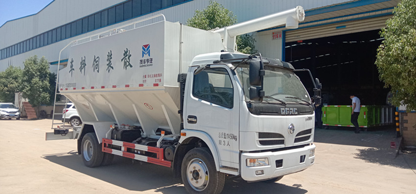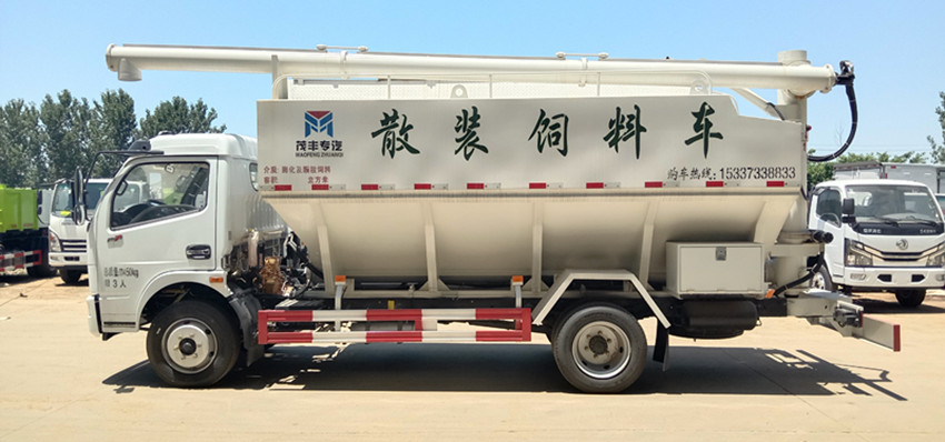 散裝飼料運(yùn)輸車,散裝飼料車的飼料罐架設(shè)在卡車的底盤上,罐頂開有進(jìn)料口.頂部的一根螺旋輸送卸料管(俗稱卸料絞龍)則可自由回轉(zhuǎn)和抬升,抬升的仰角可達(dá)60度。運(yùn)輸時,頂部的螺旋管平臥在罐頂;卸料時則抬起,使管端的出料口與畜禽飼養(yǎng)場貯料罐頂部的進(jìn)料門相接,駕駛室內(nèi)裝有操縱裝置(操縱裝置也可裝置在罐體尾部),卸料時通過車底的動力輸出軸和減速器來驅(qū)動螺旋,以完成卸料。