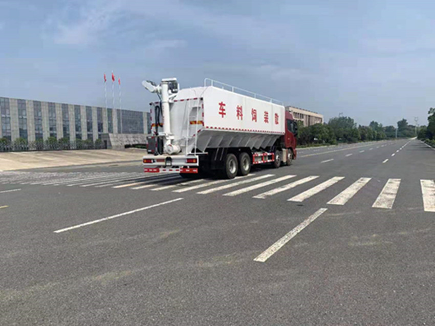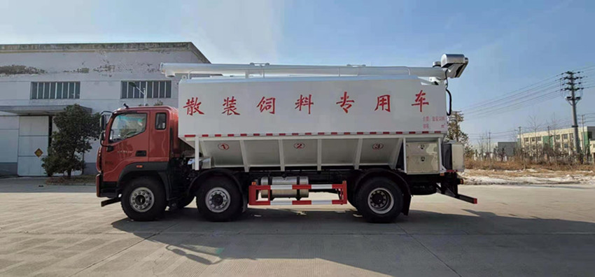 散裝飼料運輸車,散裝飼料車的飼料罐架設(shè)在卡車的底盤上,罐頂開有進(jìn)料口.頂部的一根螺旋輸送卸料管(俗稱卸料絞龍)則可自由回轉(zhuǎn)和抬升,抬升的仰角可達(dá)60度。運輸時,頂部的螺旋管平臥在罐頂;卸料時則抬起,使管端的出料口與畜禽飼養(yǎng)場貯料罐頂部的進(jìn)料門相接,駕駛室內(nèi)裝有操縱裝置(操縱裝置也可裝置在罐體尾部),卸料時通過車底的動力輸出軸和減速器來驅(qū)動螺旋,以完成卸料。