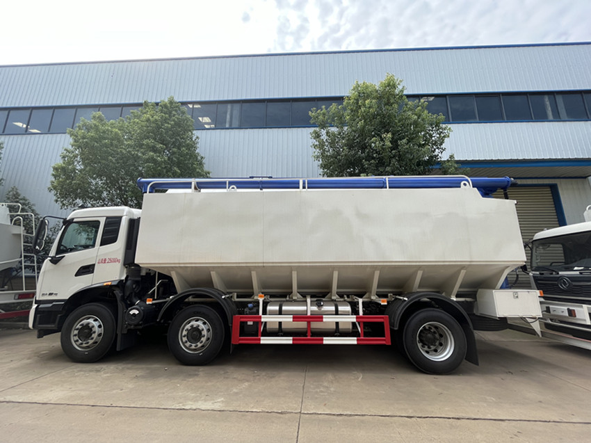 散裝飼料運輸車,散裝飼料車的飼料罐架設在卡車的底盤上,罐頂開有進料口.頂部的一根螺旋輸送卸料管(俗稱卸料絞龍)則可自由回轉和抬升,抬升的仰角可達60度。運輸時,頂部的螺旋管平臥在罐頂;卸料時則抬起,使管端的出料口與畜禽飼養(yǎng)場貯料罐頂部的進料門相接,駕駛室內裝有操縱裝置(操縱裝置也可裝置在罐體尾部),卸料時通過車底的動力輸出軸和減速器來驅動螺旋,以完成卸料。