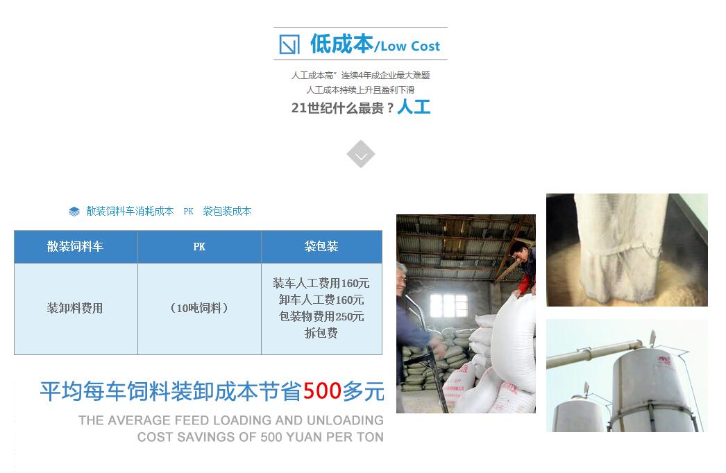 一個年產(chǎn)量為15萬噸的飼料廠,直銷:經(jīng)銷比例=3:7,直銷運送范圍大約100-200公里。使用散裝車經(jīng)濟(jì)效益分析:年直銷量約:4.5萬噸。若以2萬噸可以使用散裝車運送計算。2萬噸,按標(biāo)準(zhǔn)40KG/袋,共需50萬只編織袋,如果按每只編織袋成本0.8元,每年可節(jié)約袋子費用40萬;再加上人工裝卸費用約18元/噸,2萬噸可直接節(jié)約36萬元,去除使用散裝飼料車裝卸所需電耗2元/噸,一年4萬,合計72萬元。按照2萬噸運輸量,平均每天運輸約55噸,故3輛10噸飼料車(每輛每天運輸2次),3輛飼料車(非整車)約60萬元,故不用一年便可收回成本。